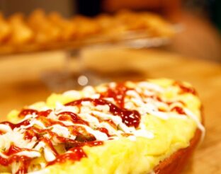 Kumpir malzemeleriyle hazırlanmış, baharatlı et ve sebzeli pide.